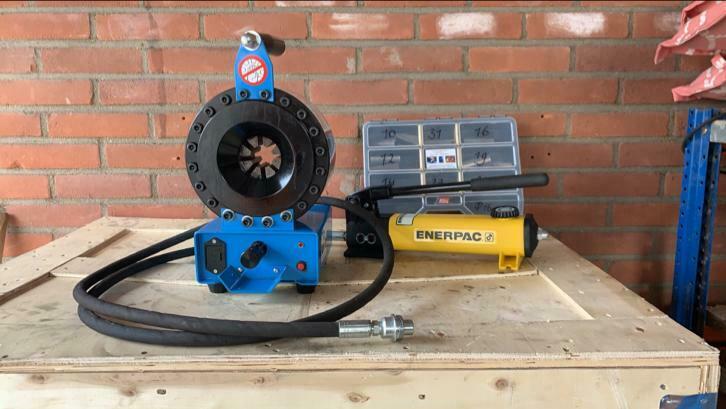 Mobiele slangenpers p16hpz is Zeer compact en geschikt voor het persen van slangen in werkplaats of op locatie door de losse handpomp zeer geschikt voor reparatie werk . machine is voorzien met 700bar Enerpac hand pomp. en alle persblokken
