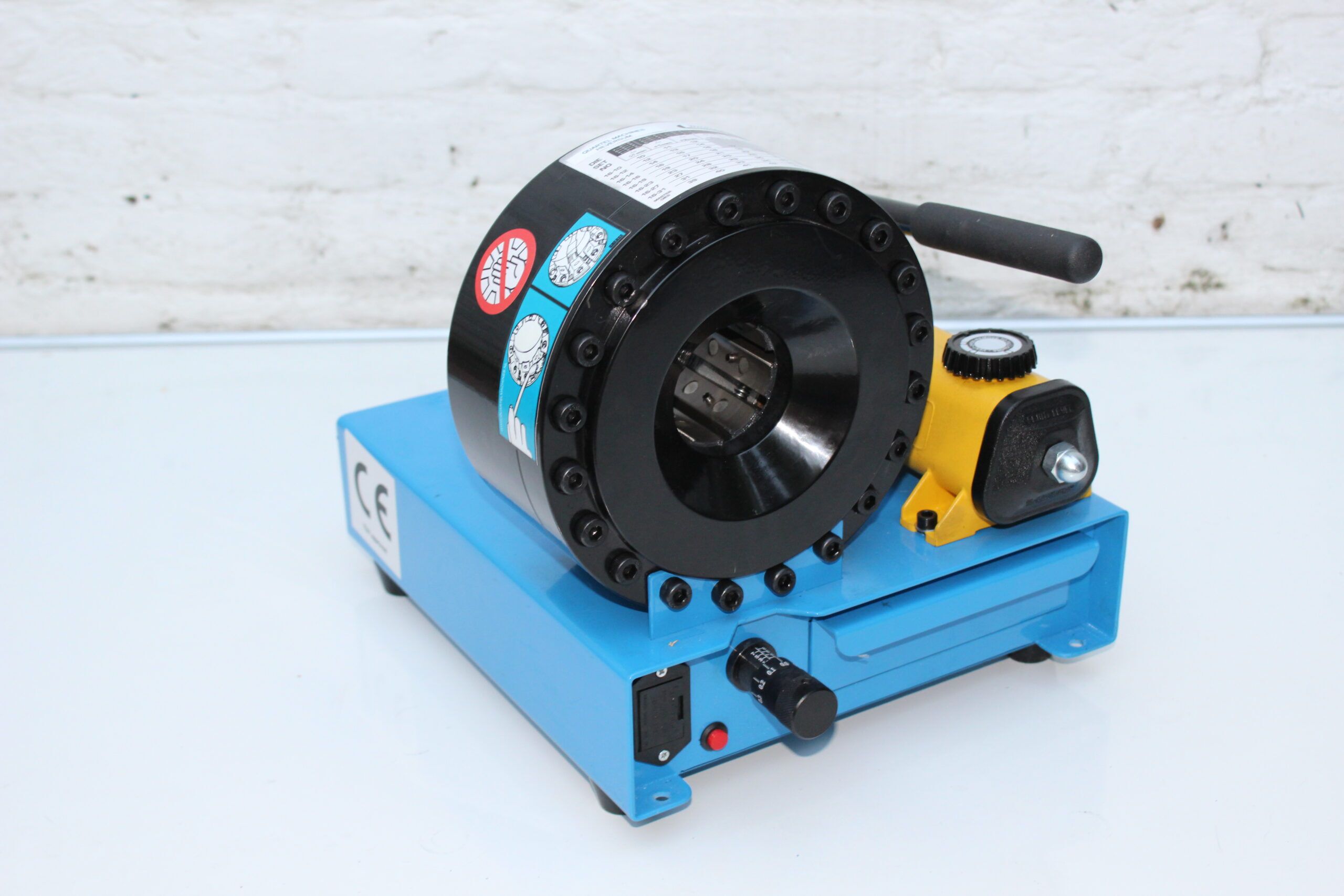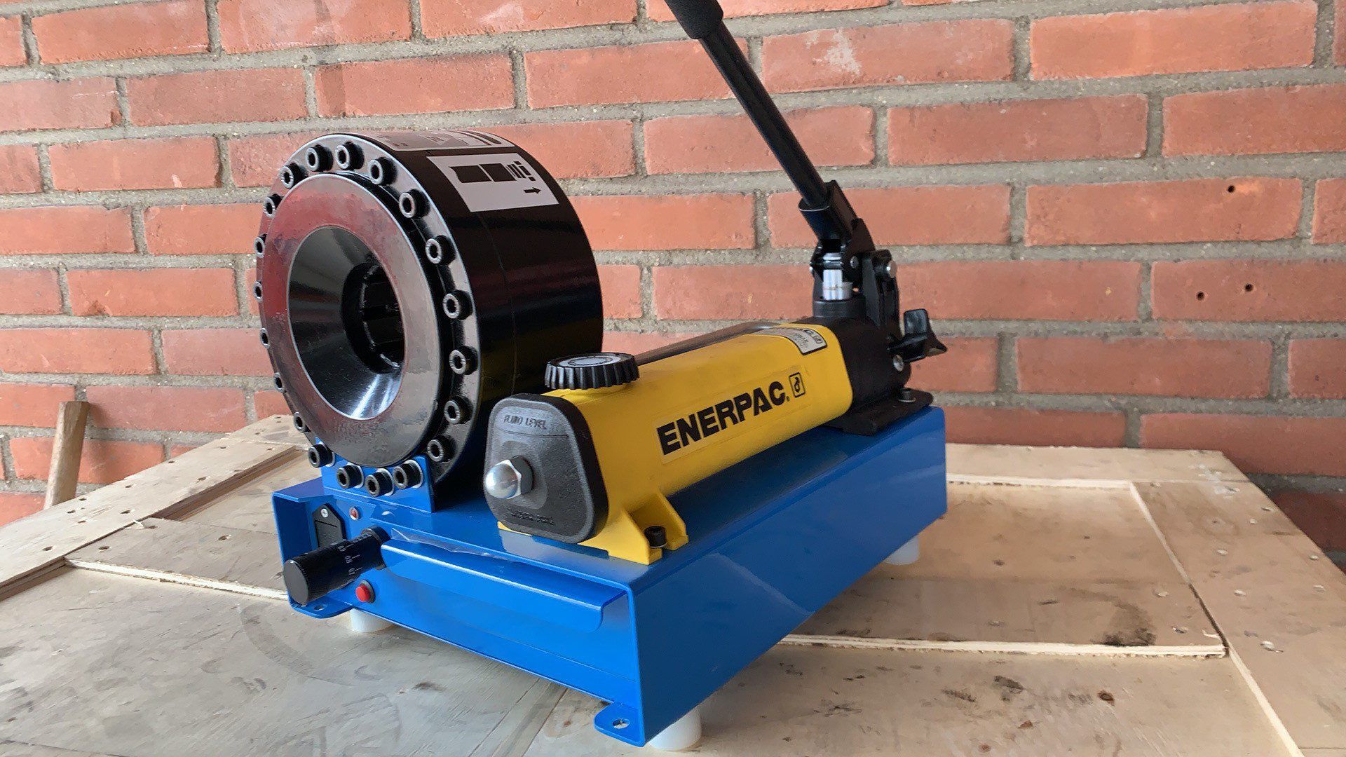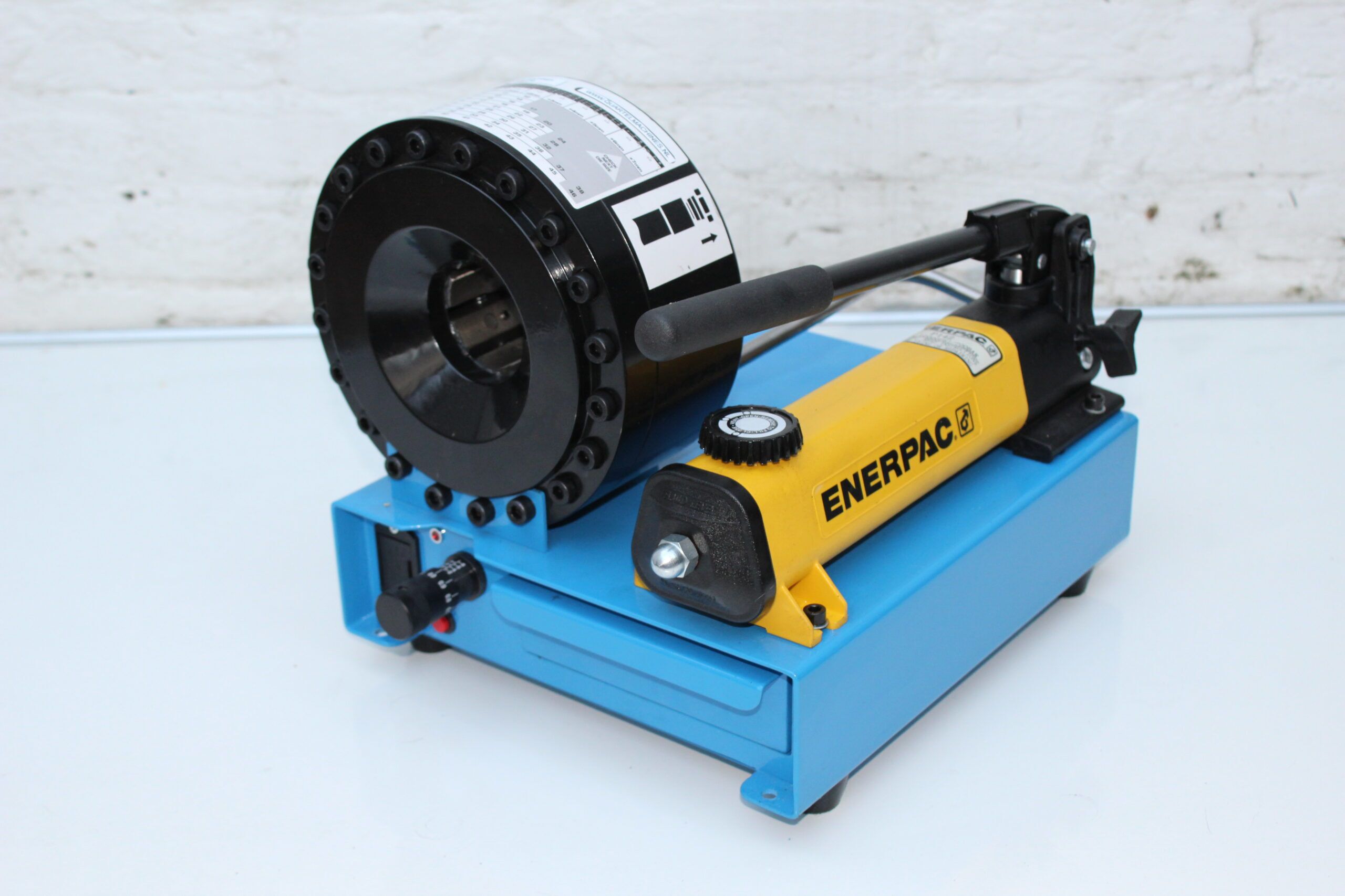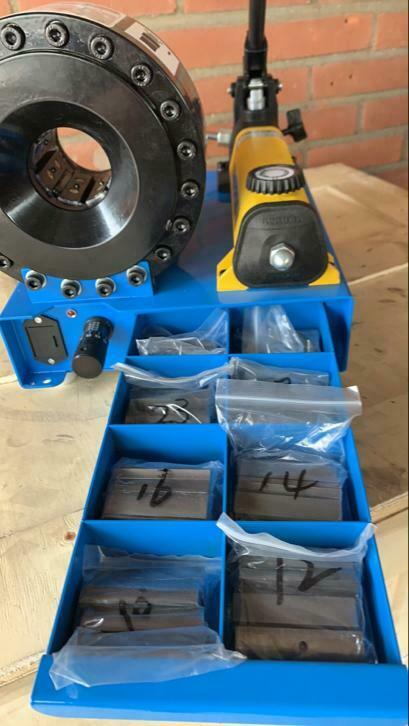 Mobiele slangenpers p16hp is Zeer compact en geschikt voor het persen van slangen in werkplaats of op locatie . machine is voorzien met 700bar Enerpac hand pomp. en alle persblokken 10 12 14 16 19 23 27 31 mm
