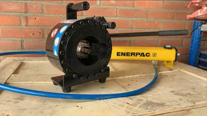 P18 HPZ slangenpers Zeer compact en geschikt voor het repareren van slangen in werkplaats of in het veld . machine wordt geleverd met 700bar Enerpac hand pomp en slang met snelkoppeling . en alle persblokken