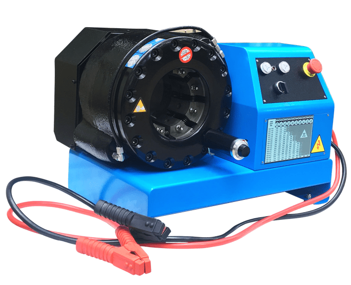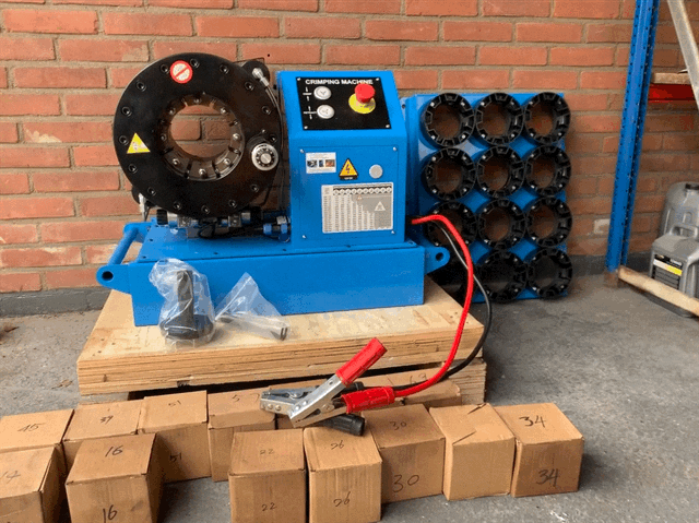 20x 12 of 24v slangenpers geschikt voor het vervaardigen repareren van slangen in mobiele werkplaats of in het veld . machine wordt geleverd met snelwissel rek en tool en alle persblokken.