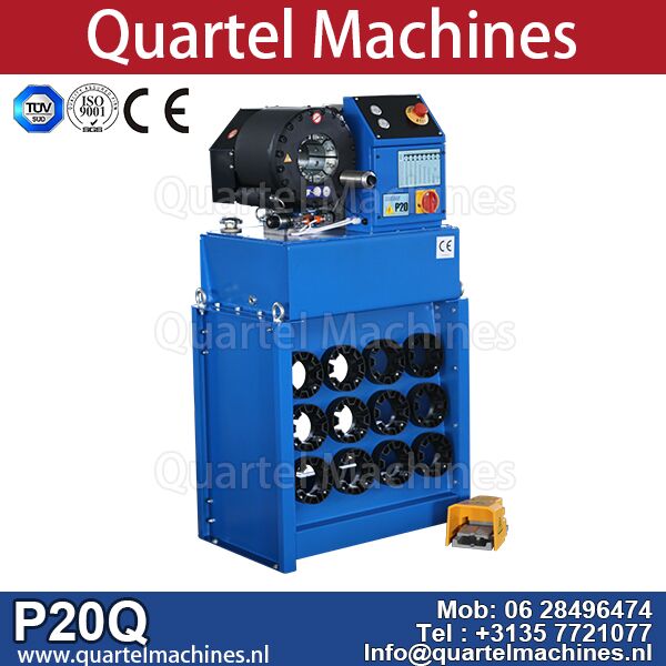 P20Q hydraulische slangpers met snelwisselsysteem en alle persbekken . Deze machine perst hydraulische slangen tot 1,1/2′ voor de hoogste kwaliteit. Pers gemaakt van de beste componenten (SIEMENS-motor, EATON-schakelaar, Rexroth-pomp) TOP machine!!